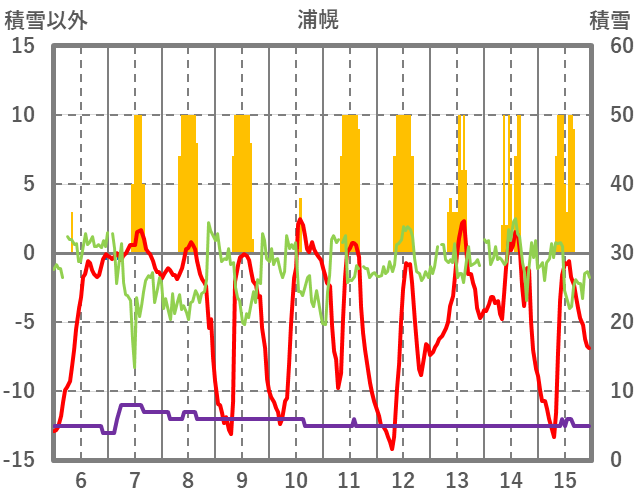 | 日 | 時 | 気温 | 降水 | 風向/風速 | 日照 | 積雪 | 降雪 |