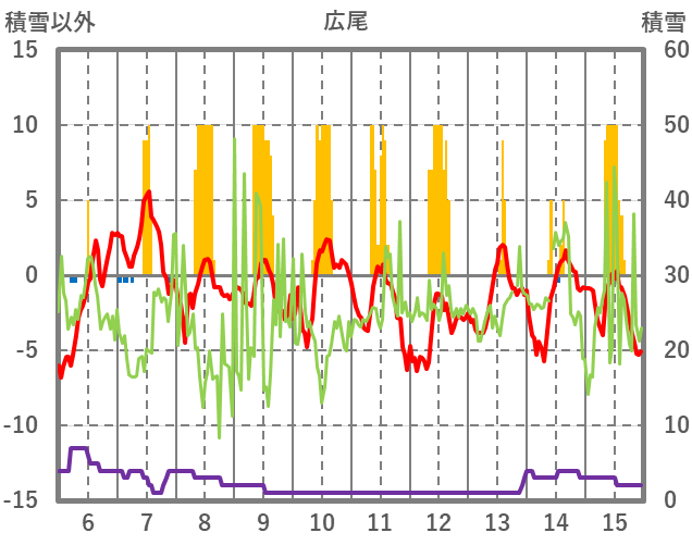 | 日 | 時 | 気温 | 降水 | 風向/風速 | 日照 | 積雪 | 降雪 |