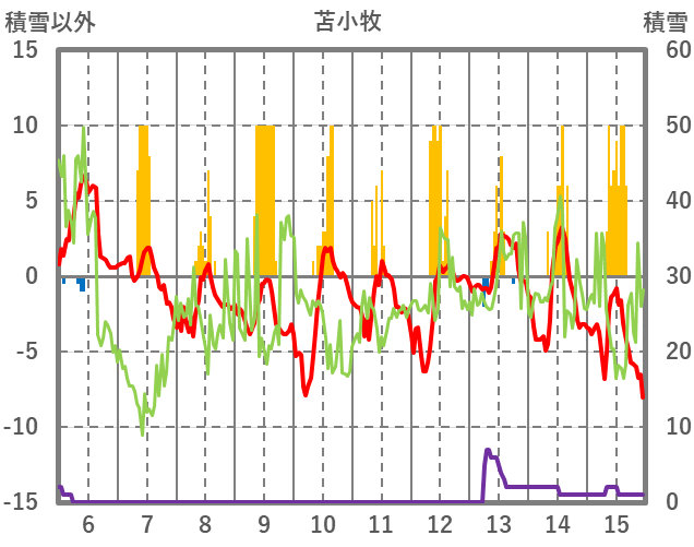 | 日 | 時 | 気温 | 降水 | 風向/風速 | 日照 | 積雪 | 降雪 |