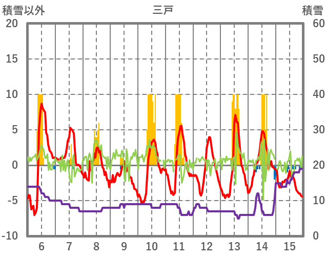 | 日 | 時 | 気温 | 降水 | 風向/風速 | 日照 | 積雪 | 降雪 |