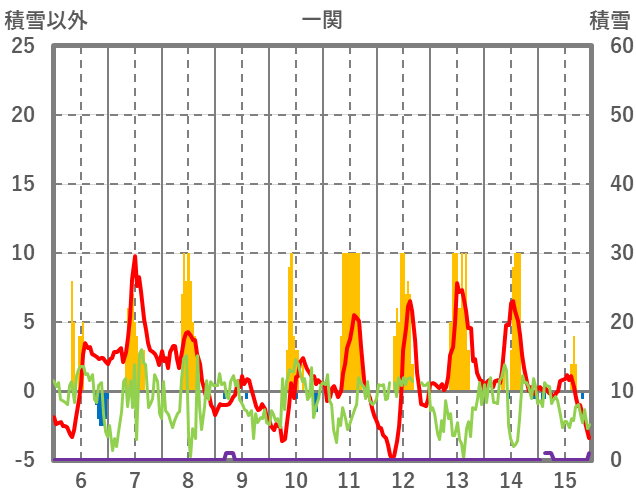 | 日 | 時 | 気温 | 降水 | 風向/風速 | 日照 | 積雪 | 降雪 |