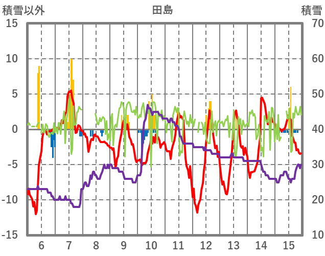 | 日 | 時 | 気温 | 降水 | 風向/風速 | 日照 | 積雪 | 降雪 |