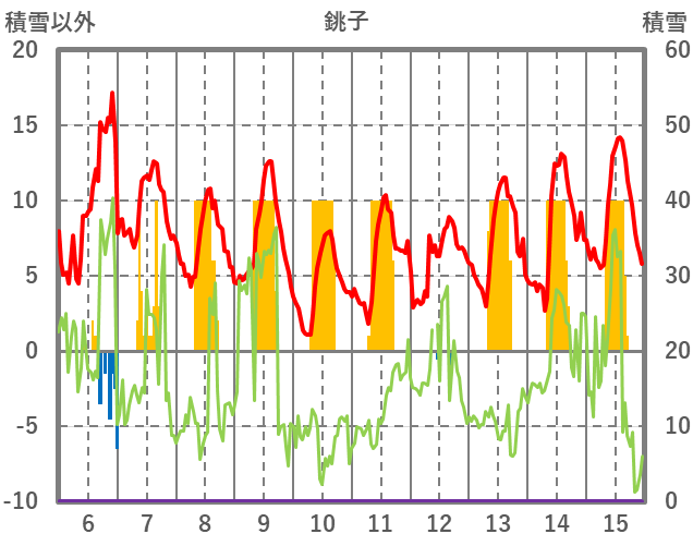 | 日 | 時 | 気温 | 降水 | 風向/風速 | 日照 | 積雪 | 降雪 |