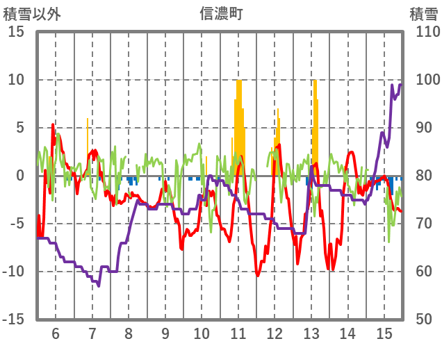 | 日 | 時 | 気温 | 降水 | 風向/風速 | 日照 | 積雪 | 降雪 |