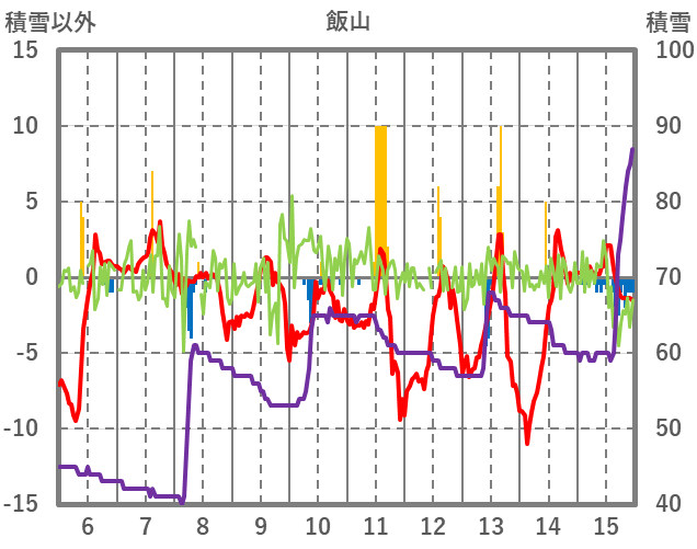 | 日 | 時 | 気温 | 降水 | 風向/風速 | 日照 | 積雪 | 降雪 |