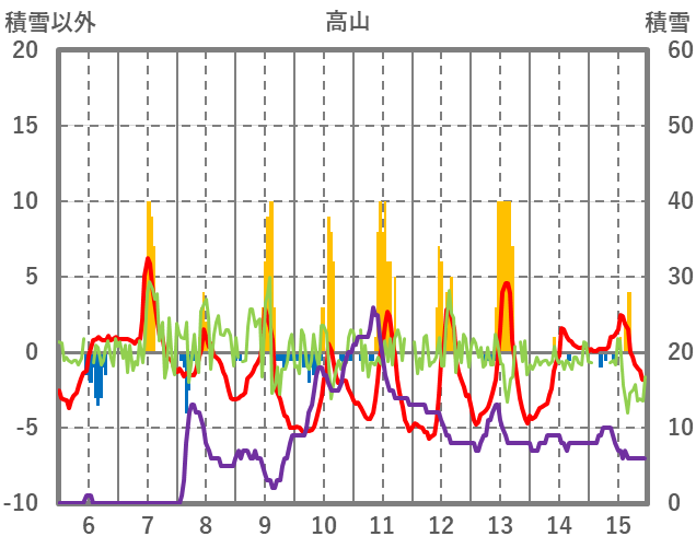 | 日 | 時 | 気温 | 降水 | 風向/風速 | 日照 | 積雪 | 降雪 |