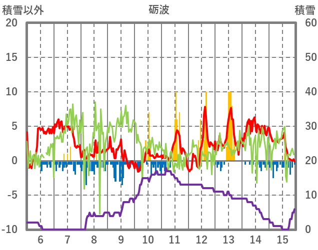 | 日 | 時 | 気温 | 降水 | 風向/風速 | 日照 | 積雪 | 降雪 |