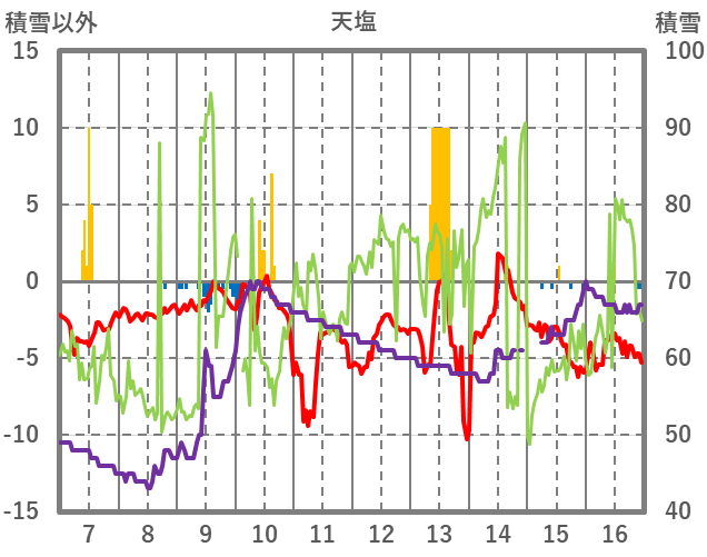 | 日 | 時 | 気温 | 降水 | 風向/風速 | 日照 | 積雪 | 降雪 |