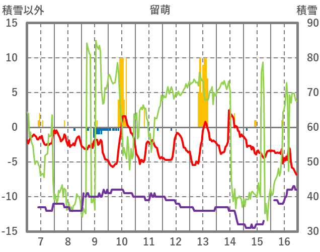 | 日 | 時 | 気温 | 降水 | 風向/風速 | 日照 | 積雪 | 降雪 |
