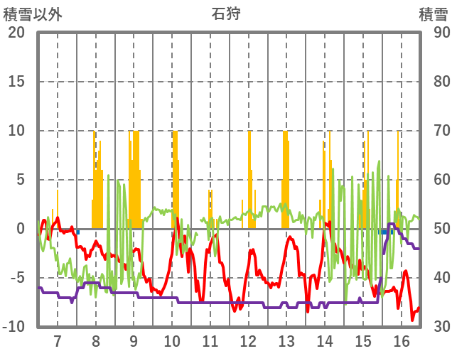 | 日 | 時 | 気温 | 降水 | 風向/風速 | 日照 | 積雪 | 降雪 |