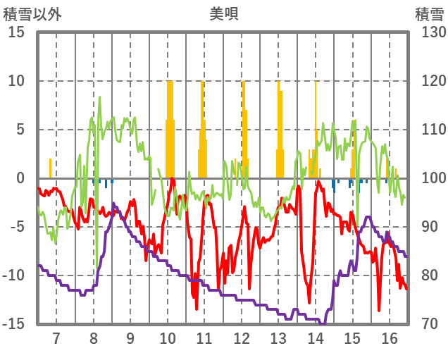 | 日 | 時 | 気温 | 降水 | 風向/風速 | 日照 | 積雪 | 降雪 |