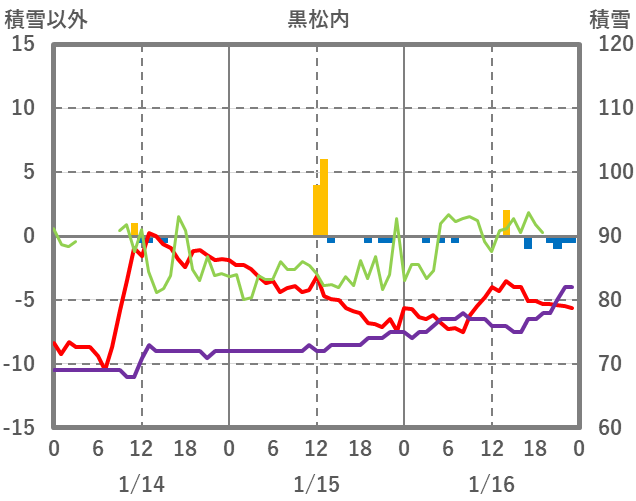 | 日 | 時 | 気温 | 降水 | 風向/風速 | 日照 | 積雪 | 降雪 |