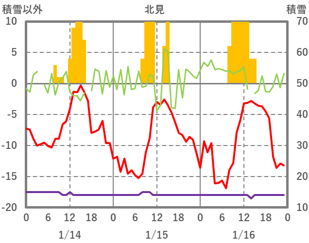 | 日 | 時 | 気温 | 降水 | 風向/風速 | 日照 | 積雪 | 降雪 |