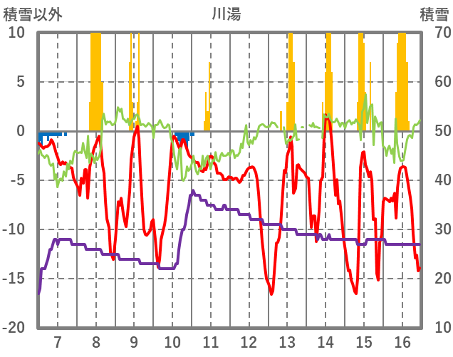 | 日 | 時 | 気温 | 降水 | 風向/風速 | 日照 | 積雪 | 降雪 |