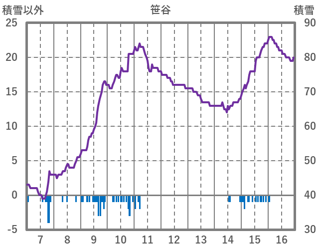 | 日 | 時 | 気温 | 降水 | 風向/風速 | 日照 | 積雪 | 降雪 |