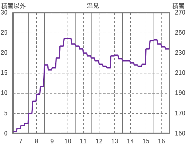 | 日 | 時 | 気温 | 降水 | 風向/風速 | 日照 | 積雪 | 降雪 |