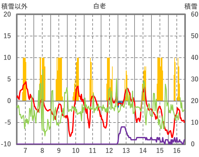 | 日 | 時 | 気温 | 降水 | 風向/風速 | 日照 | 積雪 | 降雪 |