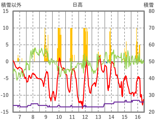 | 日 | 時 | 気温 | 降水 | 風向/風速 | 日照 | 積雪 | 降雪 |
