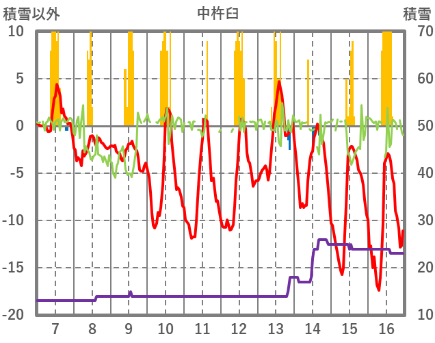 | 日 | 時 | 気温 | 降水 | 風向/風速 | 日照 | 積雪 | 降雪 |
