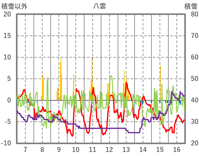 | 日 | 時 | 気温 | 降水 | 風向/風速 | 日照 | 積雪 | 降雪 |