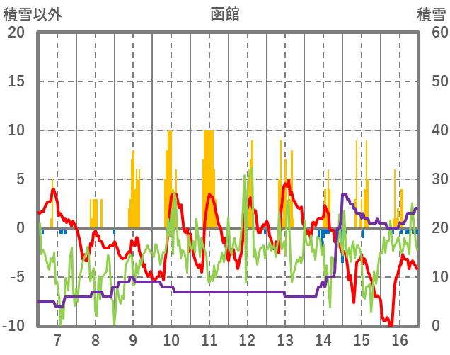 | 日 | 時 | 気温 | 降水 | 風向/風速 | 日照 | 積雪 | 降雪 |
