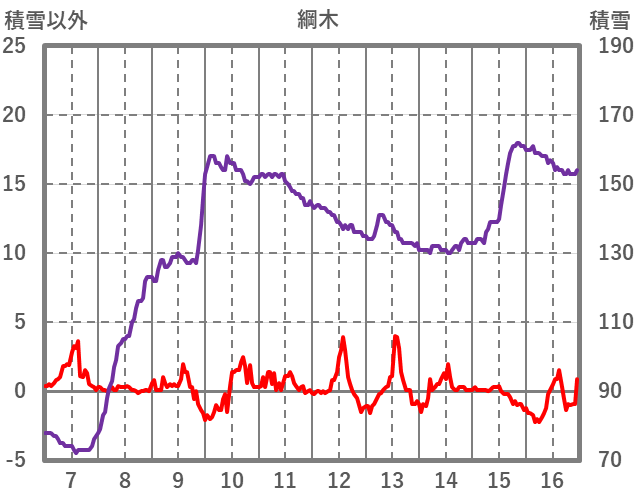 | 日 | 時 | 気温 | 降水 | 風向/風速 | 日照 | 積雪 | 降雪 |