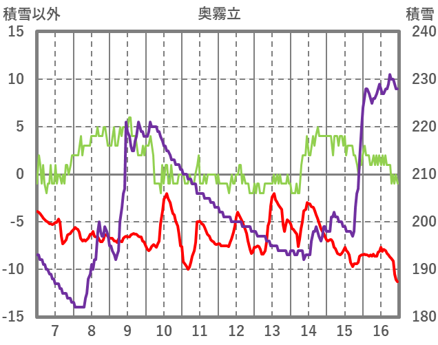 | 日 | 時 | 気温 | 降水 | 風向/風速 | 日照 | 積雪 | 降雪 |