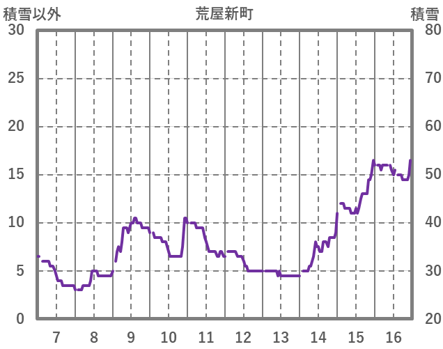 | 日 | 時 | 気温 | 降水 | 風向/風速 | 日照 | 積雪 | 降雪 |