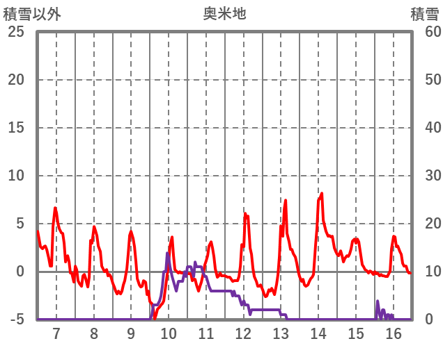 | 日 | 時 | 気温 | 降水 | 風向/風速 | 日照 | 積雪 | 降雪 |