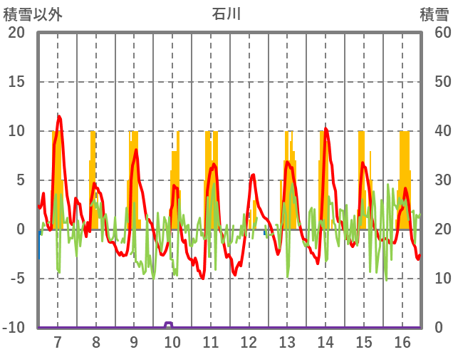 | 日 | 時 | 気温 | 降水 | 風向/風速 | 日照 | 積雪 | 降雪 |