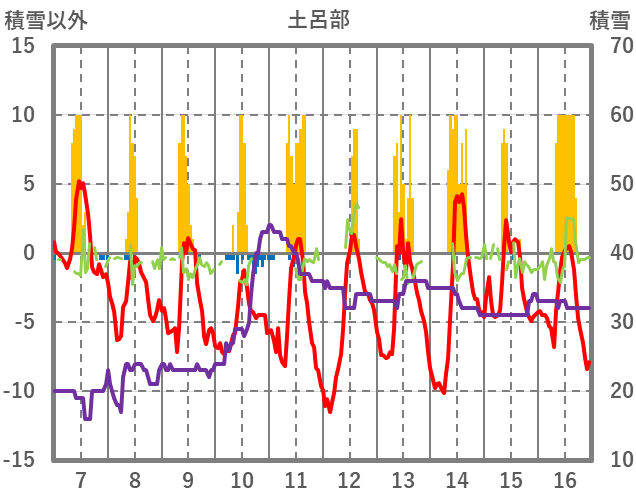 | 日 | 時 | 気温 | 降水 | 風向/風速 | 日照 | 積雪 | 降雪 |