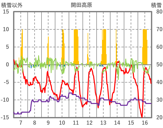 | 日 | 時 | 気温 | 降水 | 風向/風速 | 日照 | 積雪 | 降雪 |