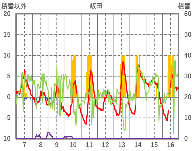 | 日 | 時 | 気温 | 降水 | 風向/風速 | 日照 | 積雪 | 降雪 |