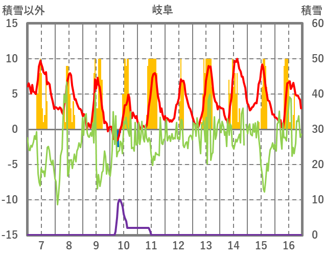 | 日 | 時 | 気温 | 降水 | 風向/風速 | 日照 | 積雪 | 降雪 |