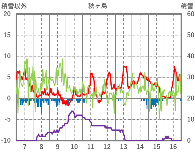 | 日 | 時 | 気温 | 降水 | 風向/風速 | 日照 | 積雪 | 降雪 |