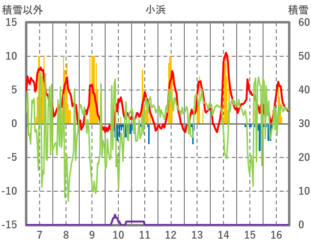 | 日 | 時 | 気温 | 降水 | 風向/風速 | 日照 | 積雪 | 降雪 |