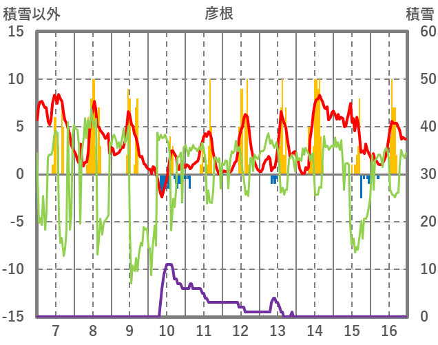 | 日 | 時 | 気温 | 降水 | 風向/風速 | 日照 | 積雪 | 降雪 |