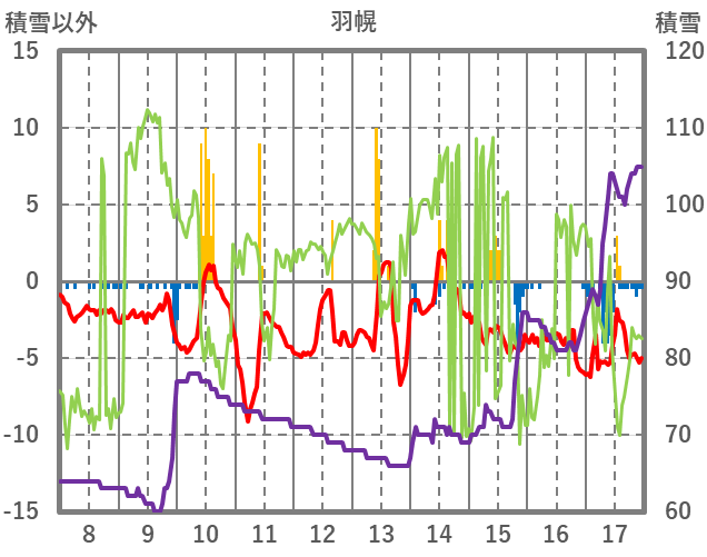 | 日 | 時 | 気温 | 降水 | 風向/風速 | 日照 | 積雪 | 降雪 |