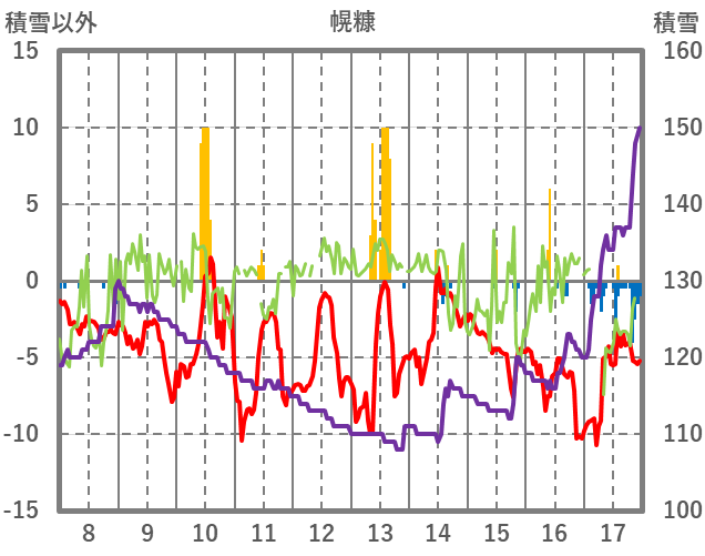 | 日 | 時 | 気温 | 降水 | 風向/風速 | 日照 | 積雪 | 降雪 |