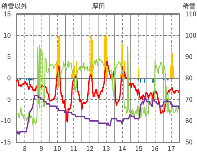 | 日 | 時 | 気温 | 降水 | 風向/風速 | 日照 | 積雪 | 降雪 |