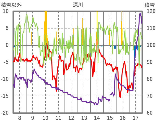 | 日 | 時 | 気温 | 降水 | 風向/風速 | 日照 | 積雪 | 降雪 |
