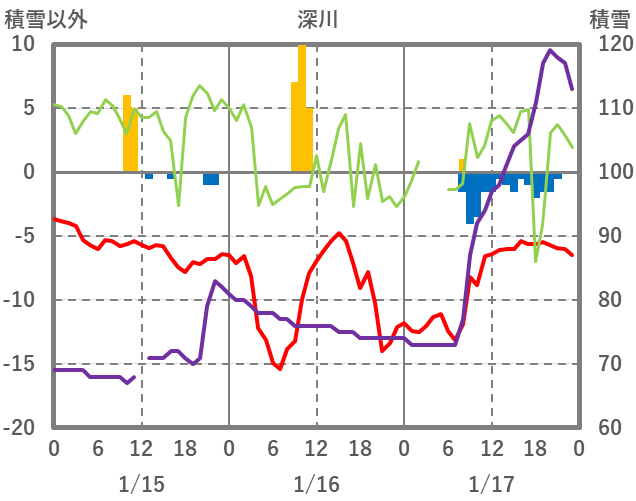 | 日 | 時 | 気温 | 降水 | 風向/風速 | 日照 | 積雪 | 降雪 |