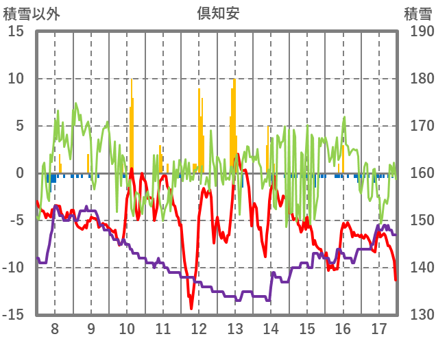 | 日 | 時 | 気温 | 降水 | 風向/風速 | 日照 | 積雪 | 降雪 |