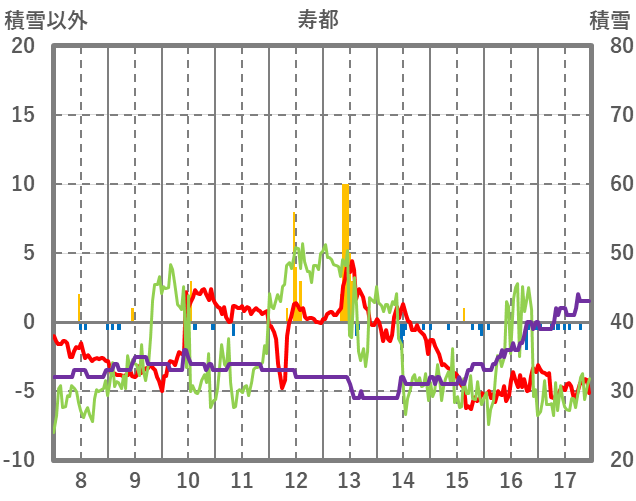 | 日 | 時 | 気温 | 降水 | 風向/風速 | 日照 | 積雪 | 降雪 |