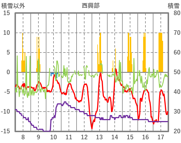 | 日 | 時 | 気温 | 降水 | 風向/風速 | 日照 | 積雪 | 降雪 |