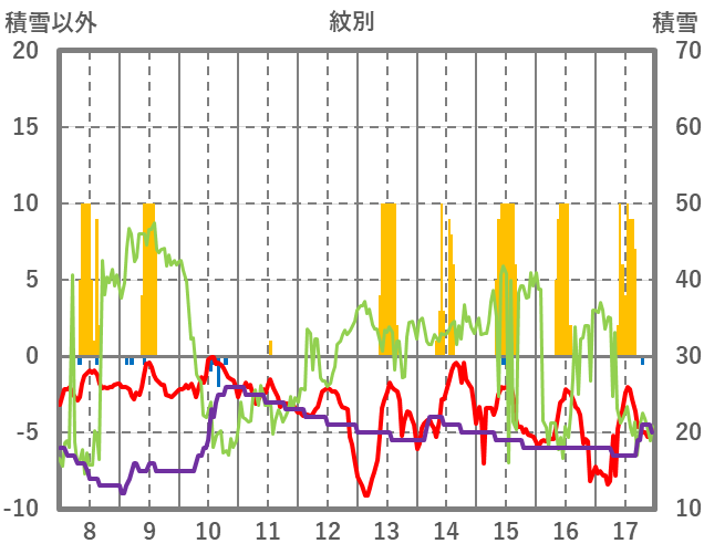 | 日 | 時 | 気温 | 降水 | 風向/風速 | 日照 | 積雪 | 降雪 |