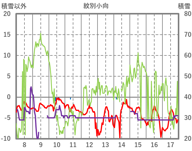 | 日 | 時 | 気温 | 降水 | 風向/風速 | 日照 | 積雪 | 降雪 |
