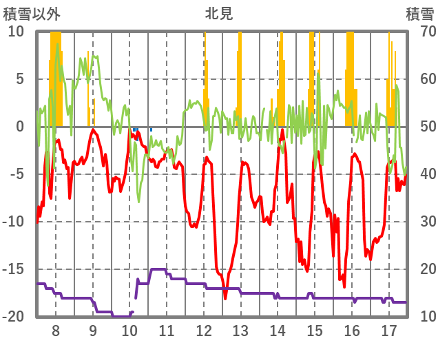 | 日 | 時 | 気温 | 降水 | 風向/風速 | 日照 | 積雪 | 降雪 |