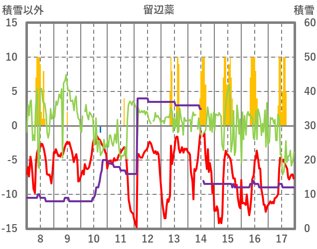 | 日 | 時 | 気温 | 降水 | 風向/風速 | 日照 | 積雪 | 降雪 |