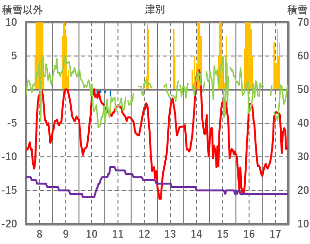 | 日 | 時 | 気温 | 降水 | 風向/風速 | 日照 | 積雪 | 降雪 |